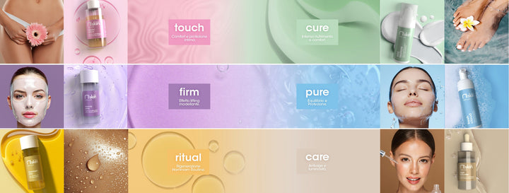 PURE, CARE, FIRM, RITUAL, TOUCH e CURE.